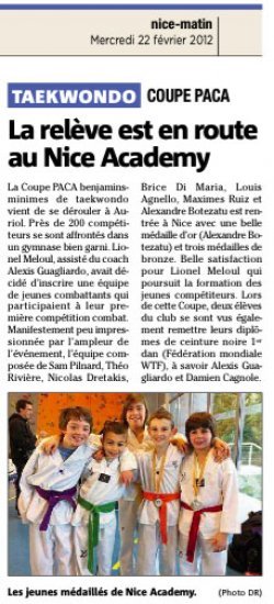 Ce dimanche s’est déroulé la coupe PACA Benjamin Minimes à Auriol, près de 200 compétiteurs se sont affrontés dans un gymnase bien garni. Lionel Meloul assisté d’Alexis GUAGLIARDO comme coach avait décidé d’inscrire une équipe de jeunes combattants qui participaient à leur première compétition combat. Manifestement peu impressionnés par l’ampleur de l’événement, l’équipe composée de Sam PILNARD, Théo RIVIERE, Nicolas DRETAKIS, Brice DI MARIA, Louis AGNELLO, Maximes RUIZ et Alexandre BOTEZATU est rentrée à Nice avec une belle médaille d’or 5(Alexandre BOTEZATU)et 3 médaille de Bronze. Belle satisfaction pour Lionel Meloul qui poursuit la formation de jeunes compétiteurs. Lors de cette Coupe deux élèves du club se sont vu également remettre leurs diplômes de ceinture noire 1er dan (fédération Mondiale WTF) à savoir Alexis GUAGLIARDO et Damien CAGNOLE.