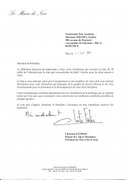 Félicitations de maire de Nice concernant le label obtenu de la FFTDA par le club TAEKWONDO NICE ACADEMY.