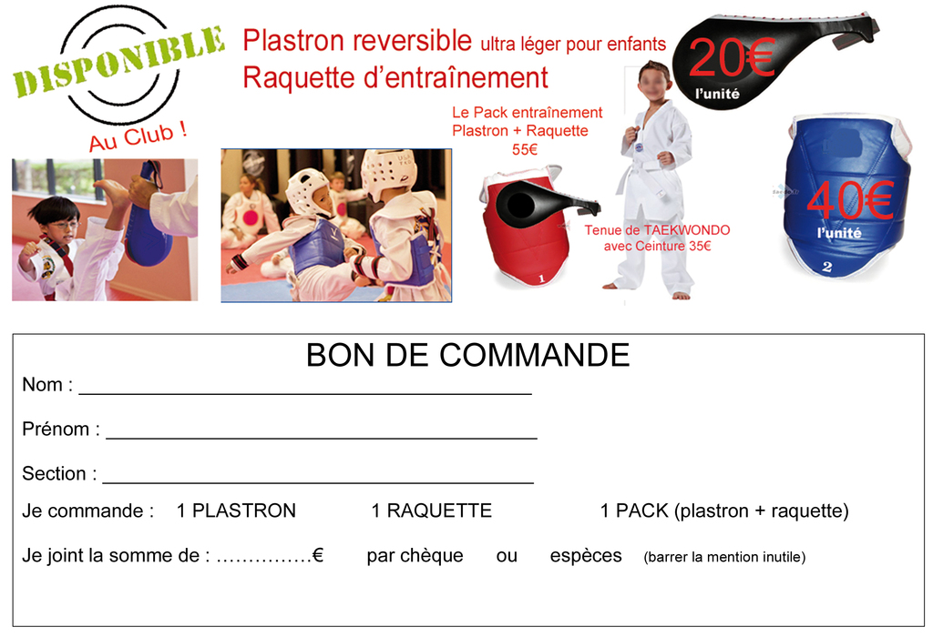 Les adhérents du club petits et grands peuvent désormais acquérir les plastrons et raquettes nécessaires au bon bon fonctionnement des entrainements. Vous pouvez passer commande au près de votre responsable !